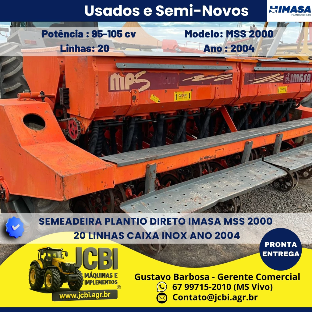 A Semeadeira Plantio Direto Imasa MSS 2000, fabricada em 2004, é um implemento agrícola eficiente, ideal para operações de plantio direto. Este modelo usado está em ótimo estado de conservação, mas necessita de revisão geral para garantir seu pleno funcionamento.